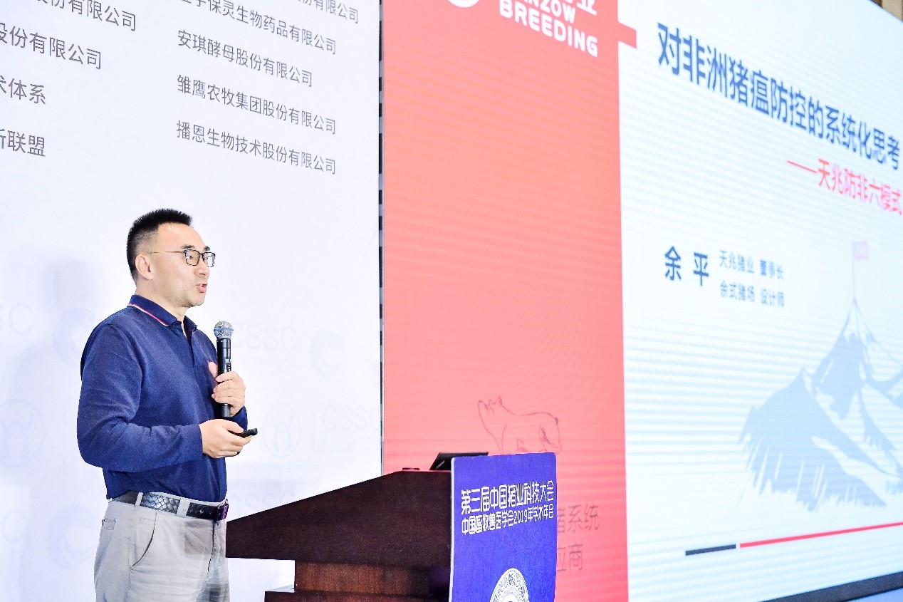 天兆豬業(yè)作為此次大會(huì)的發(fā)起人單位,對(duì)大會(huì)予以了全力支持。天兆豬業(yè)董事長余平在會(huì)上作了《對(duì)非洲豬瘟防控的系統(tǒng)化思考——天兆防非六模式》的主題報(bào)告,分享了在這場令養(yǎng)豬人談“非”色變的重大疫情中,作為養(yǎng)豬業(yè)的上游,種豬企業(yè)如何做好生物安全防控。